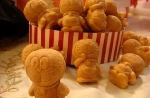 日本东京的“人形烧”颇具名气,因其发源于中央区日本桥人形町而得名。传统的“人形烧”以面粉、鸡蛋、糖为基础原料烘烤制成。中间填充红豆沙馅料,外观多为象征吉祥好运的“七福神”式样。历经岁月变迁,“人形烧”出现了无馅料、蛋奶馅、抹茶馅等多样口味。