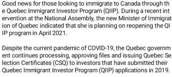 —加拿大:2021年4月魁北克投资移民重启