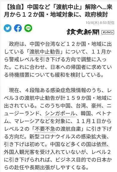据日媒报道,日本政府计划从下个月起取消对中国和其他11个国家和地区的旅行禁令。