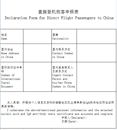 (五)如核酸检测证明和血清IgM抗体检测证明均为统一格式(格式见附件),赴华直航航班乘客可持统一格式的上述两份证明和《直接登机旅客申报表》(该表可自行在使馆网站下载打印填写,无需使馆审核)直接登机。如其中任何一份证明不属于统一格式,均需向使馆申请带“HS”标识的绿色健康码或带“HDC”标识的健康状况声明书绿色二维码(目前为纸质健康状况声明书),方可登机。