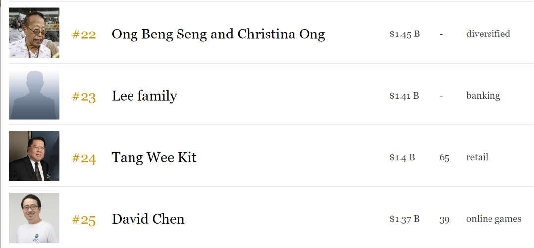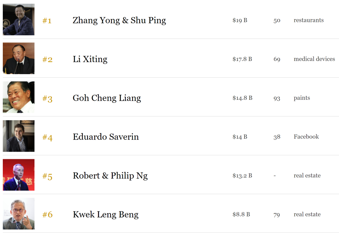 在2020年前4个月中,经济发展局EDB总共获得了近130亿新币的投资承诺。即使在疫情之下,新加坡亿万富豪(身家十亿美金以上)的人数增加了3人!这些富豪的总财富去年增长40%至1026亿美元(约1390亿新元),幅度仅次于中国是整个亚太地区第二高的。根据《福布斯亚洲》排行,新加坡富豪前25名中的,有5位都是来自中国的面孔。第1名:张勇夫妇,火锅连锁店海底捞集团创始人及主席