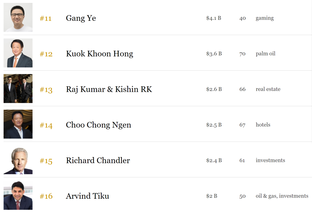 第2名:李西廷,中国深圳迈瑞医疗联合创始人兼董事长第7名:李小冬,冬海集团Sea的首席执行长兼创始人第11名:叶刚,冬海集团Sea的联合创始人和首席运营官第25名:David Chen,冬海集团Sea的联合创始人和电商业务Shopee的首席产品官他们选择了来新加坡,是被新加坡大环境所吸引,而创业成功又离不开新加坡的优良营商环境和对于创业的支持。