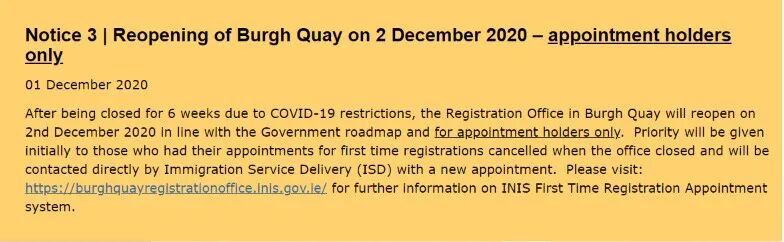 1. 位于Burgh Quay的移民局注册办公室已于12月3日重新开放,为首次登记预约被取消的申请人优先办理。