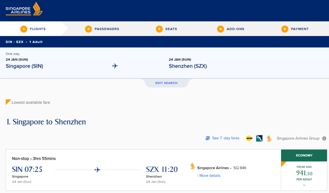 单程经济舱低至S$941.5
