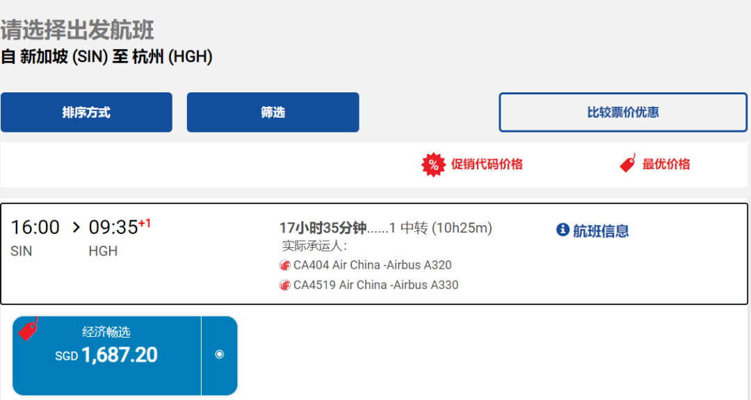 单程经济舱低至S$1687.2