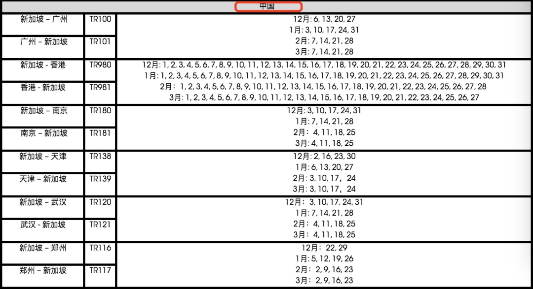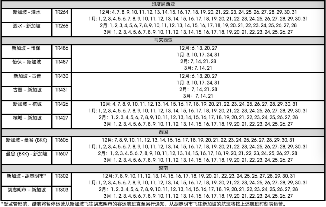 酷航最新未来3个月航班表