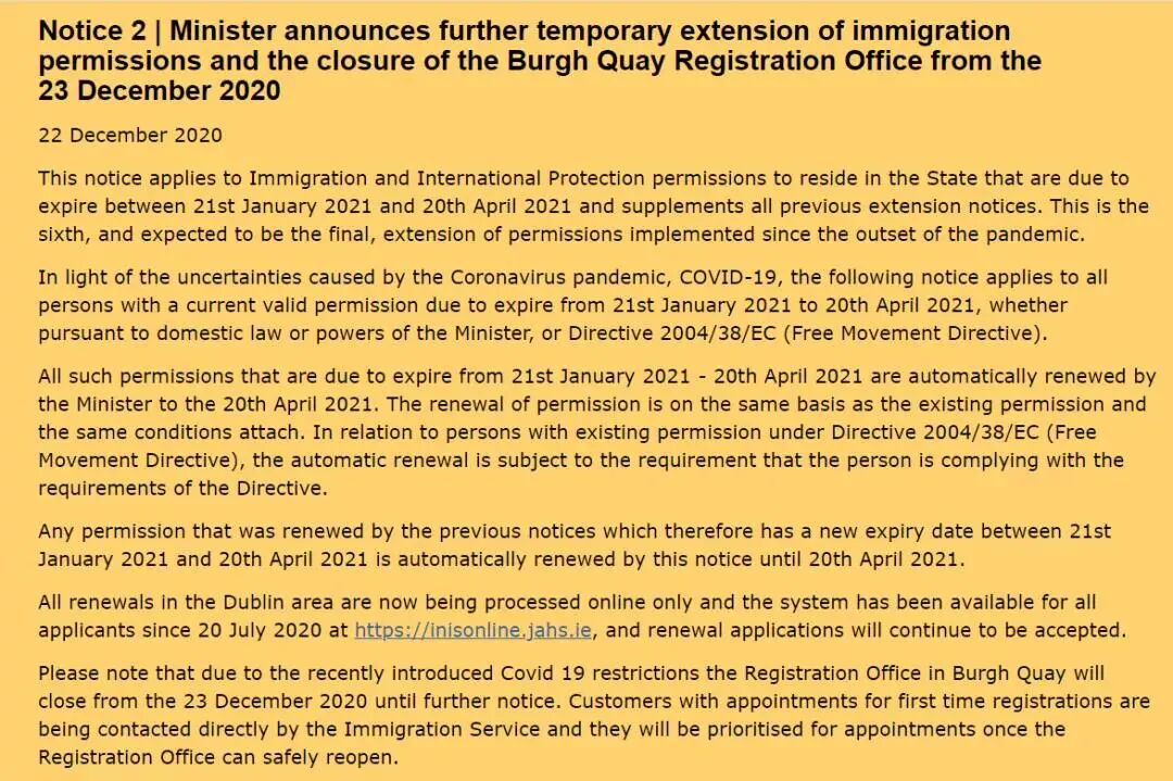 爱尔兰移民局发布最新通知:鉴于疫情造成的不确定性,该通知适用于将于2021年1月21日至2021年4月20日期间到期的移民和国际保护居留许可,并补充以前所有的延期通知。