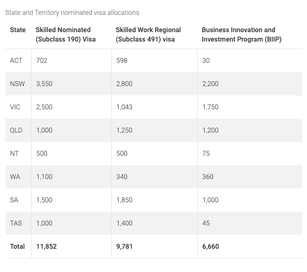 可以发现除了维州、新州和北领地以外,其他州或领地的总配额都有所减少,其中西澳更是直接砍半。不过相比189配额减少1万个,在疫情影响下,近两年州担保还是大家的首选。