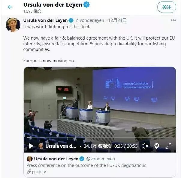 当地时间2020年12月24日下午,欧盟委员会主席冯德莱恩在布鲁塞尔召开新闻发布会,表示欧英双方现已就备受外界关注的贸易协议达成共识。