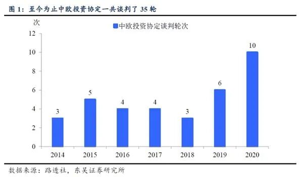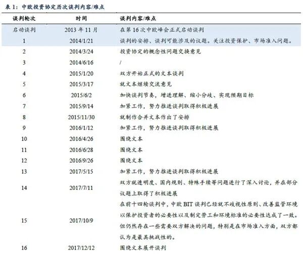 中欧投资协定历时7年达成协定。中欧双边投资协定(BIT)又称中欧全面投资协定(中欧CAI),旨在构建中欧双边投资制度安排。协定谈判2013年正式启动,至今经历了35轮谈判(图1、表1)。