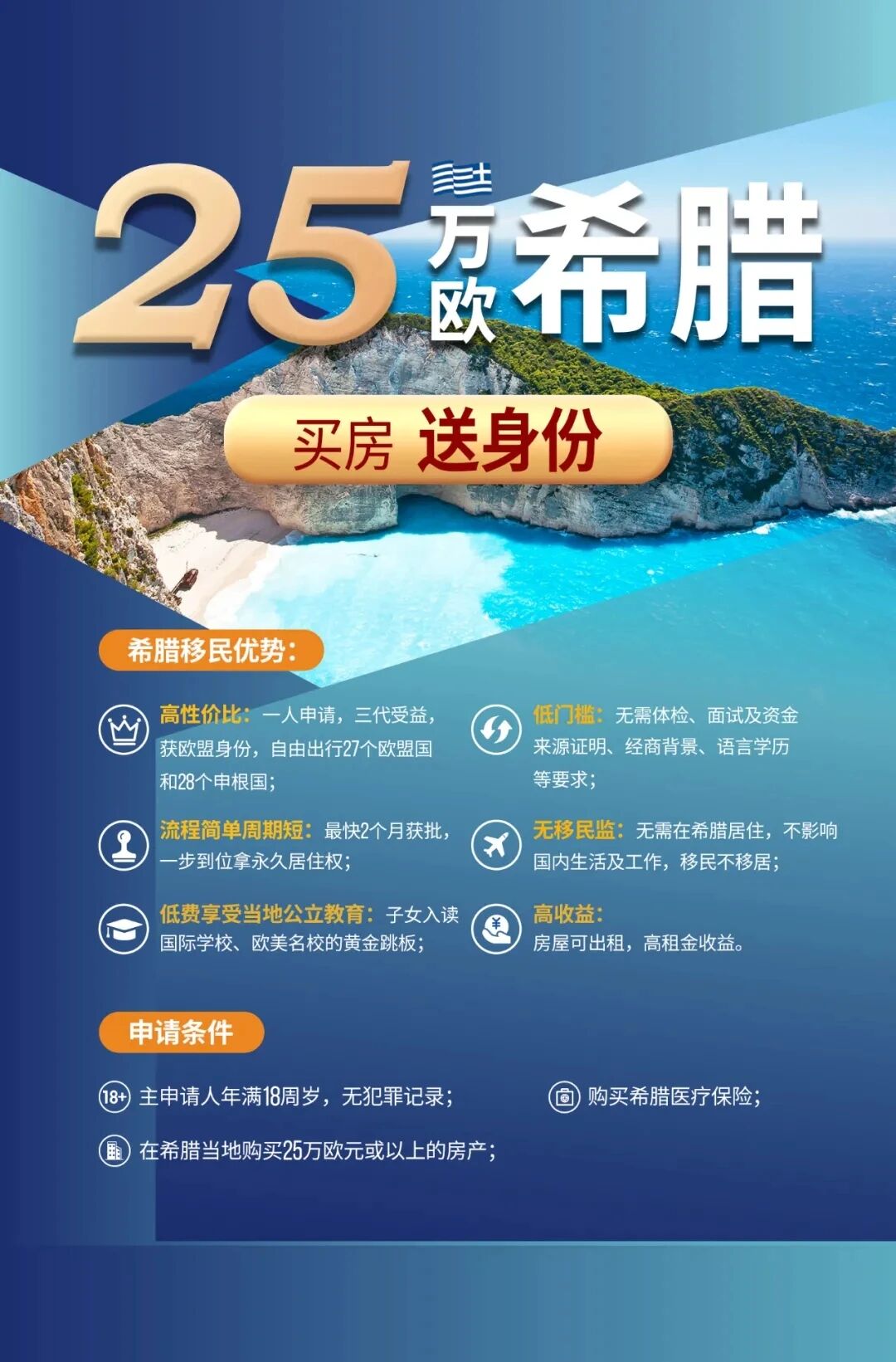 希腊是欧盟、申根、欧元三位一体国家,医疗体系全球排名第14位,蓝旗海滩数量全球第二。25万欧元希腊投资移民项目,无移民监、无语言学历要求,全家三代一步到位拿希腊永居,项目开启以来深受全球投资人的青睐。