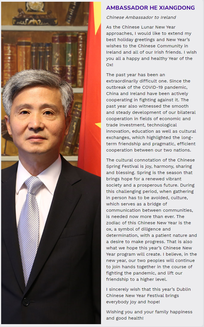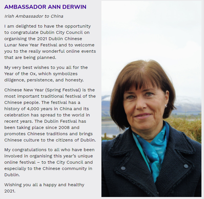 我很高兴能够有机会祝贺2021年都柏林中国农历新年活动,真诚地欢迎大家参加这场正在计划的精彩的网上庆典活动。