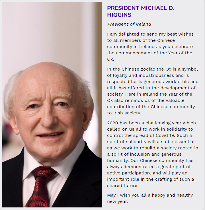 值此新春来临之际,爱尔兰总统、中爱两国大使代表发来了真挚的祝福。