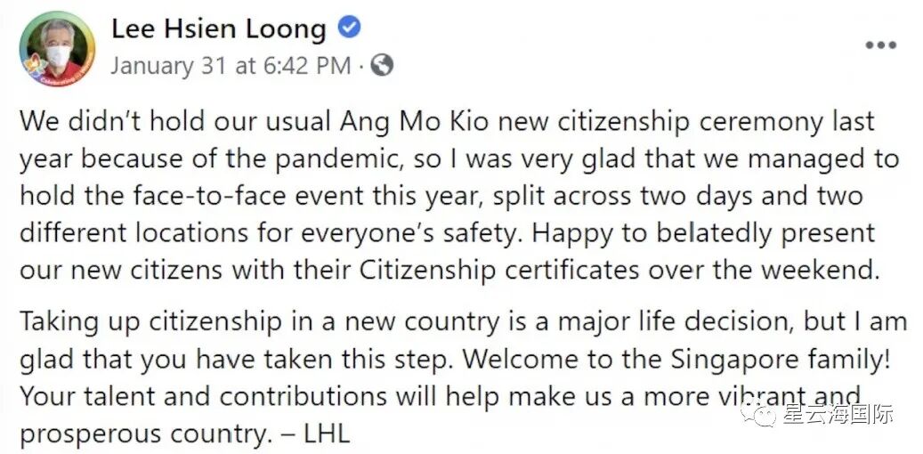 在一个新的国家获得公民身份是人生的一项重大决定,但我很高兴你们迈出了这一步。欢迎来到新加坡大家庭!你们的才华和贡献将使我们成为一个更加充满活力和繁荣的国家。