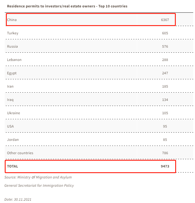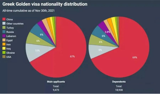 此外,根据希腊移民局公布的最新数据,截至2021年11月份,希腊共计给9473个投资者,连同他们的18,938名家属,签发了希腊黄金签证。
