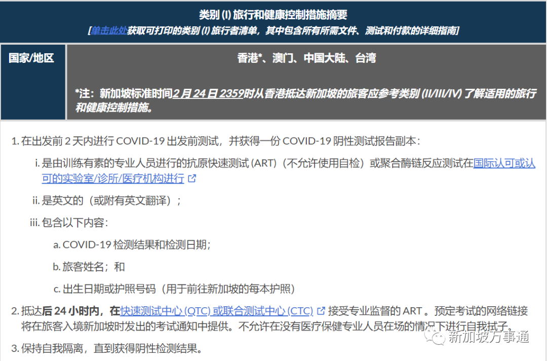 2. 依照新加坡政府最新规定,从中国入境新加坡后,只需在24小时内在检测中心进行ART检测,检测结果呈阴性即可自由活动。