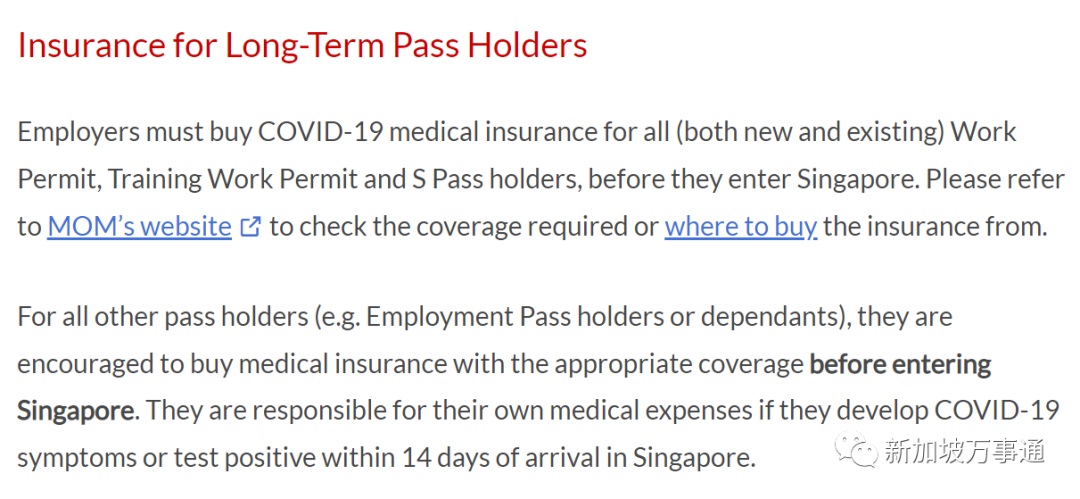 所有其他准证持有人(例如就业准证持有人或家属),建议在进入新加坡之前购买具有适当保险范围的医疗保险。若在抵达新加坡后 14 天内出现冠病症状或检测呈阳性,则需自行承担医疗费用。