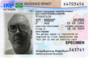 新的 IRP 卡符合最新的欧盟通用格式规范,包括持卡人的签名以及额外的安全功能,新的爱尔兰居留许可 (IRP) 卡样本: