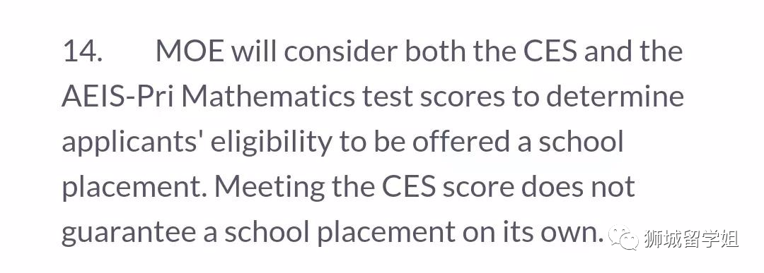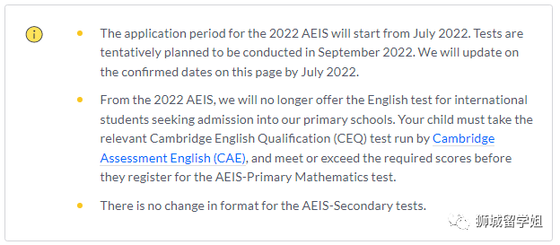 从2022年开始,教育部将不再为国际学生提供英语测试,希望进入新加坡政府小学的学生,必须参加相关的剑桥英语资格考试(CEQ)由剑桥评估英语(CEA)运行,并满足或超过要求的分数,才能注册参加 AEIS-primary 数学考试;