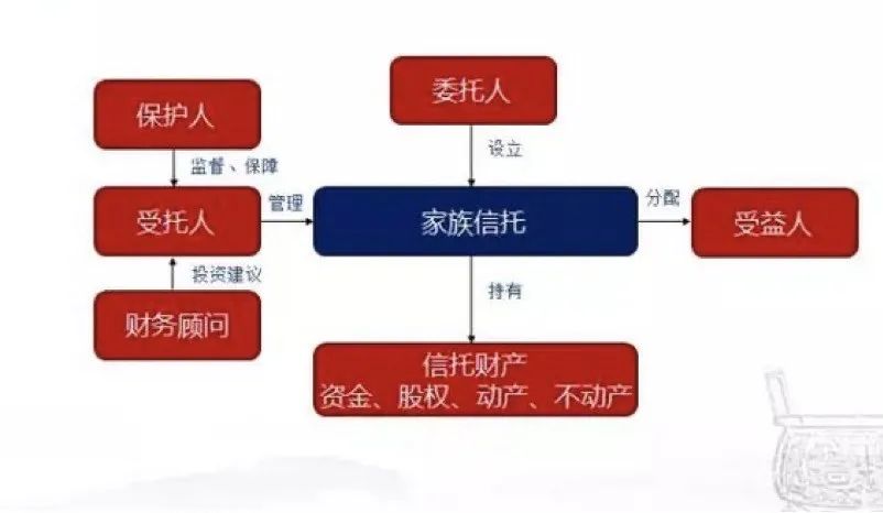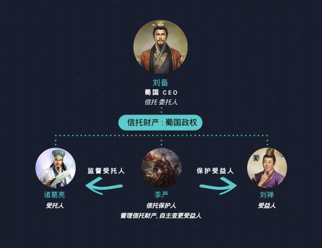 拿三国举例, 刘备的白帝城托孤, 其实就是一个典型的家族办公室中的家族信托结构。刘备病重白帝城时曾将其子刘禅和蜀国政权托付于诸葛亮, 在这个结构中,委托人是刘备,受托人是诸葛亮,受益人是刘禅,信托资产为家族产业——蜀国政权。