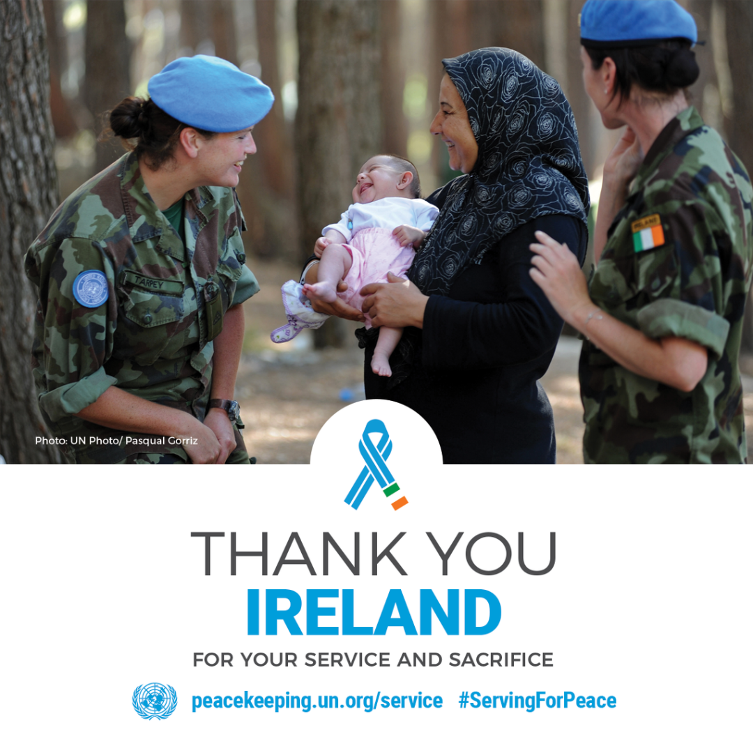 爱尔兰是世界上唯一一个自1958年以来连续参加联合国和联合国授权的和平支援行动的国家。迄今为止,爱尔兰已经参加了20多次联合国的维和任务,完成了7万多次单独巡查。不仅如此,爱尔兰也在多年来为来自世界各地的联合国维和人员提供培训,提供支持。爱尔兰维和人员在国际上受到高度尊重,因此爱尔兰政府和民间组织被广泛认为是许多国家的和平守护者。下图为2010年爱尔兰维和人员在中东地区维和并被联合国认证感谢。