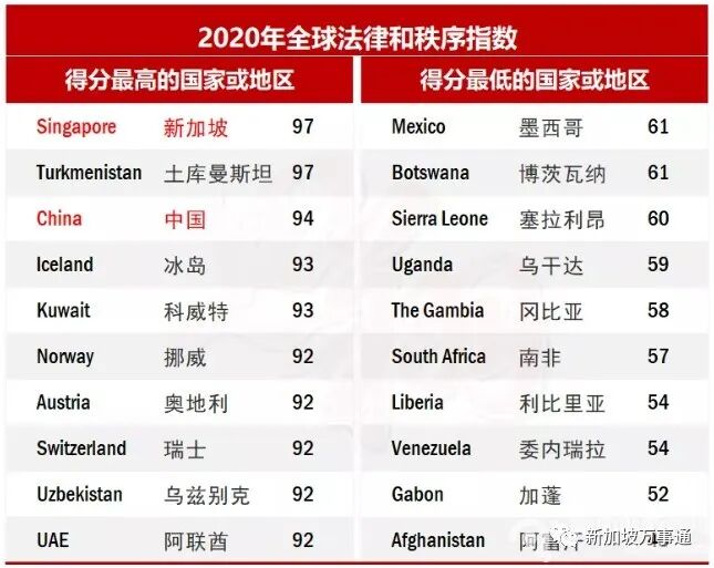 除此之外,这里的政局稳定,法律严明,使许多亚洲富豪多年来都将新加坡当成金融避风港。在2020年全球法律和秩序指数排行榜中,新加坡以97分的成绩荣登榜首!
