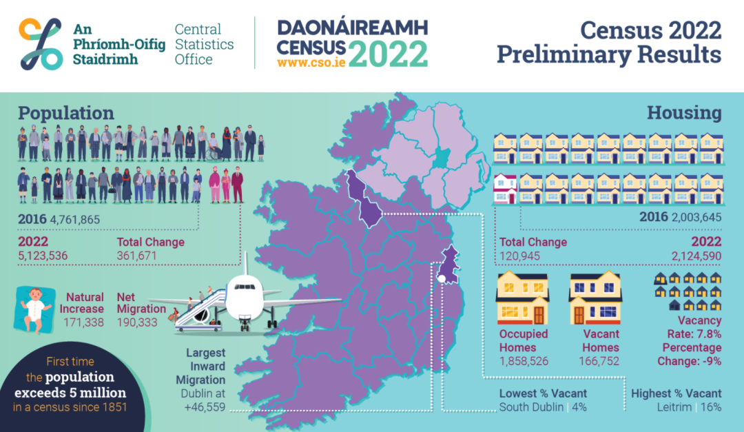 今年上半年爱尔兰中央统计局(CSO)公布的人口普查初步数据显示,爱尔兰截至2022年4月3日普查之夜的人口总数为5,123,536人,比2016年增长了7.6%。