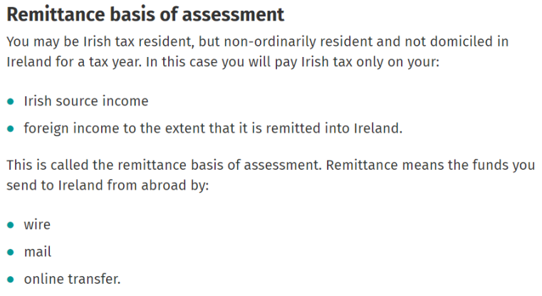 1. 在爱尔兰长期居住,成为了爱尔兰税务居民,但没有爱尔兰居籍:在这种情况下,仅对爱尔兰境内发生的收入征税,仅对汇入爱尔兰的国外收入征税,仅限于“收入”,非收入不会征税。