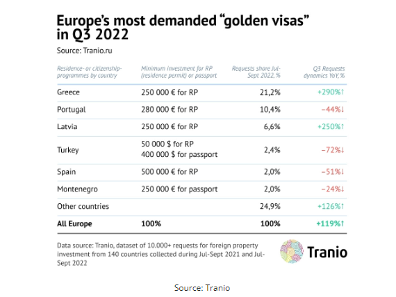 众所周知,一直以来,中国投资人都非常青睐希腊“黄金签证”。截至2022年5月30日,希腊共计发放9910份主申请黄金签证。其中,获批的主申请人有6393人来自中国,占比高达64.5%,稳居第一。另外,共计发放永居卡19401份,其中中国籍持有者12782份,占比65.8%。然而,自从希腊总理基里亚科斯·米佐塔基斯今年九月宣布将签发“黄金签证”居留许可的投资限额从25万欧元提高到50万欧元。消息引发了一系列的连锁反应,导致今年第三季度对希腊“黄金签证”计划的需求增长了290%。