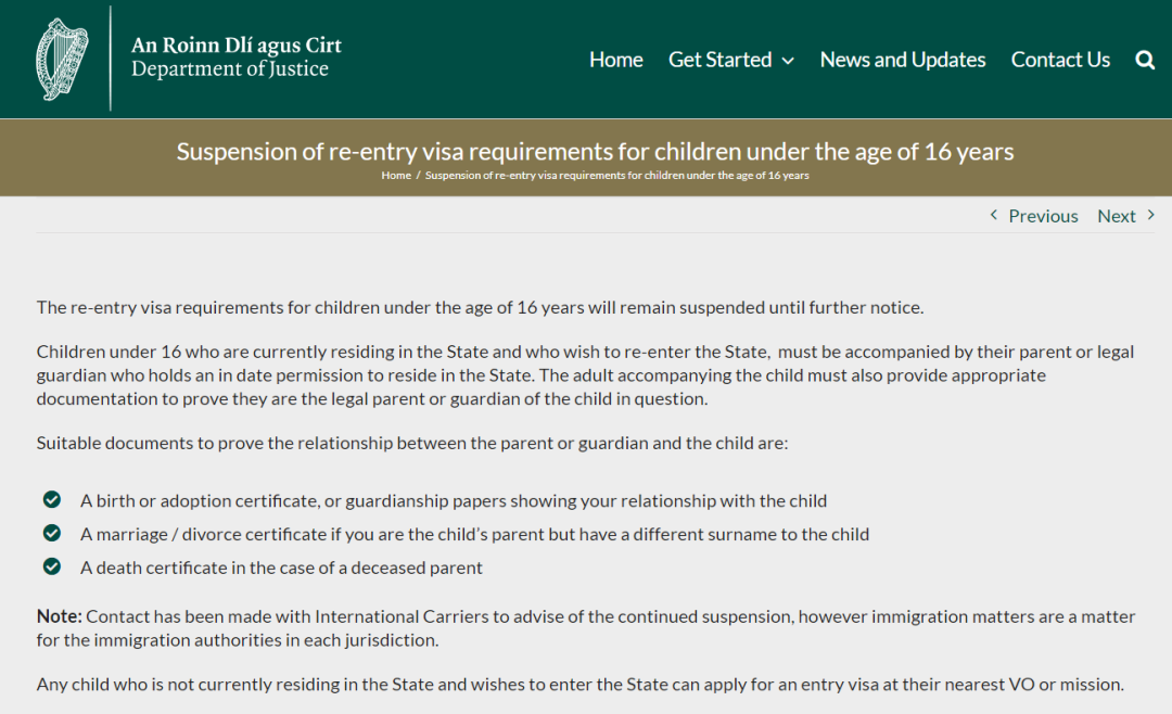 爱尔兰司法部宣布对16 岁以下儿童的往返签证要求将继续暂停,直至另行通知。