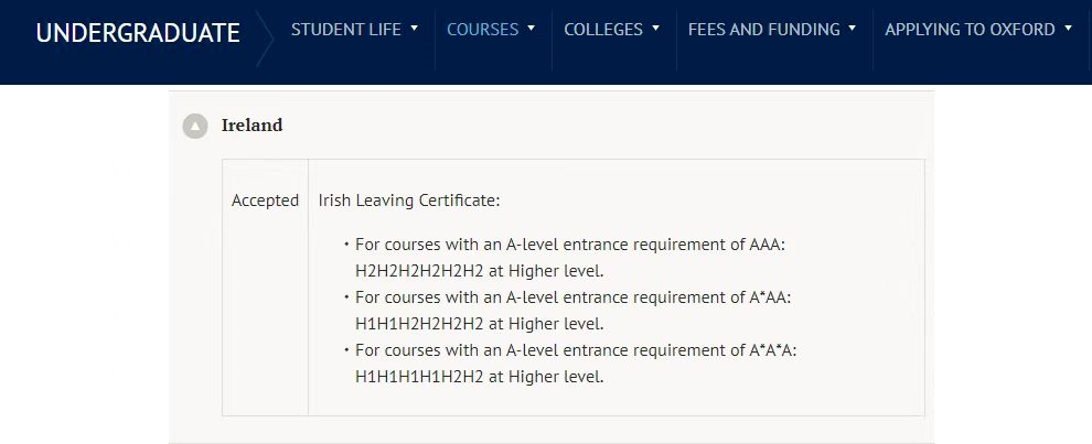 对于爱尔兰高中毕业生:爱尔兰高中毕业成绩—Leaving Certificate, 等同于英国高中毕业成绩,可直接申请牛津大学。