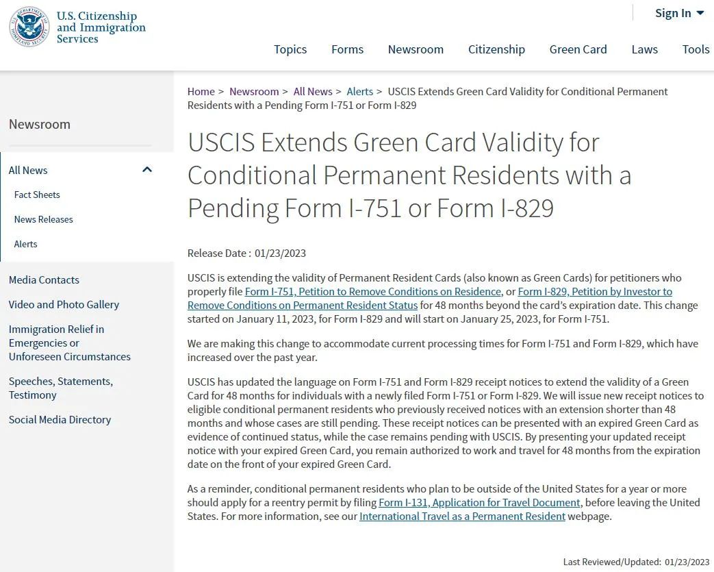 美国移民局USCIS于2023年1月23日当地时间发布消息:USCIS正在延长正确提交I-751表《申请取消永久居民的限制条件》(Petition to Remove Conditions)或I-829表《投资者申请取消永久居民的限制条件》申请人的永久居民卡,也被称为临时绿卡的有效期,有效期为条件绿卡到期日后的48个月。I-829表格的这一变化始于2023年1月11日,I-751表格将于2023年1月25日开始。