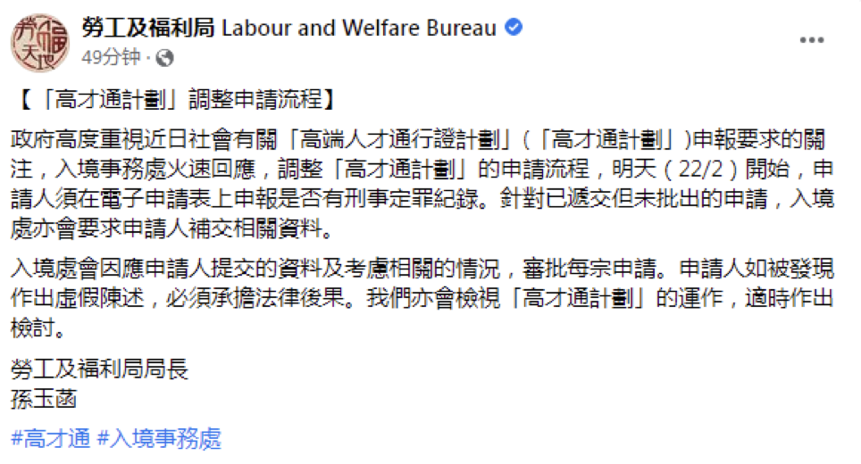 香港特区政府劳工及福利局局长孙玉菡表示,特区政府高度重视近日社会对有关“高才通计划”申报要求的关注,香港特区政府入境事务处(入境处)火速回应,调整“高才通计划”的申请流程。