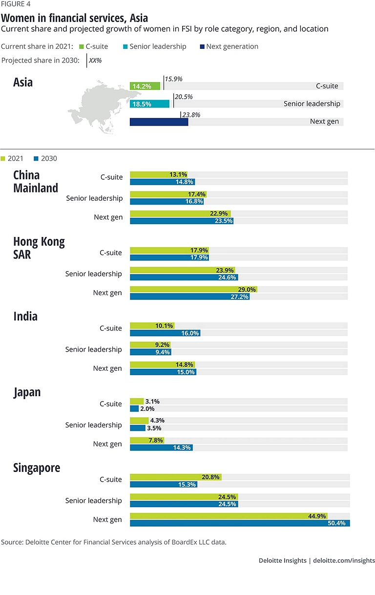 德勤在2022年对亚洲金融机构女性高管比例进行了调查,结果显示,新加坡是亚洲唯一一个预计将在未来10年内实现经理层级性别平等的国家。