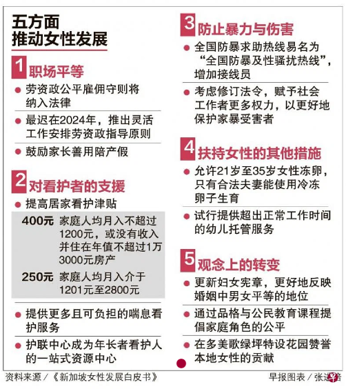 2022年3月28日,新加坡首次出台女性发展白皮书(White Paper on Singapore Women's Development),计划在未来10年,通过25个行动提升女性地位,内容涵盖5个方面,即: