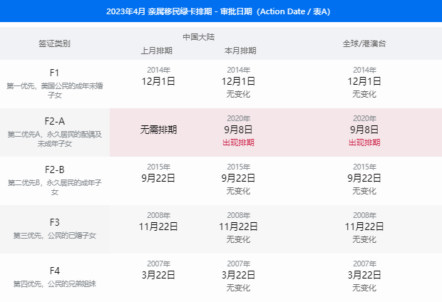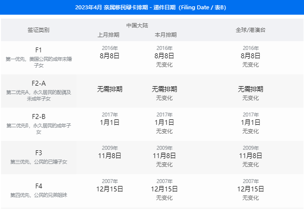 美国国务院签证办公室公布了2023年4月的签证公告(Visa Bulletin),关于职业移民和亲属移民排期表详情见以下表格。