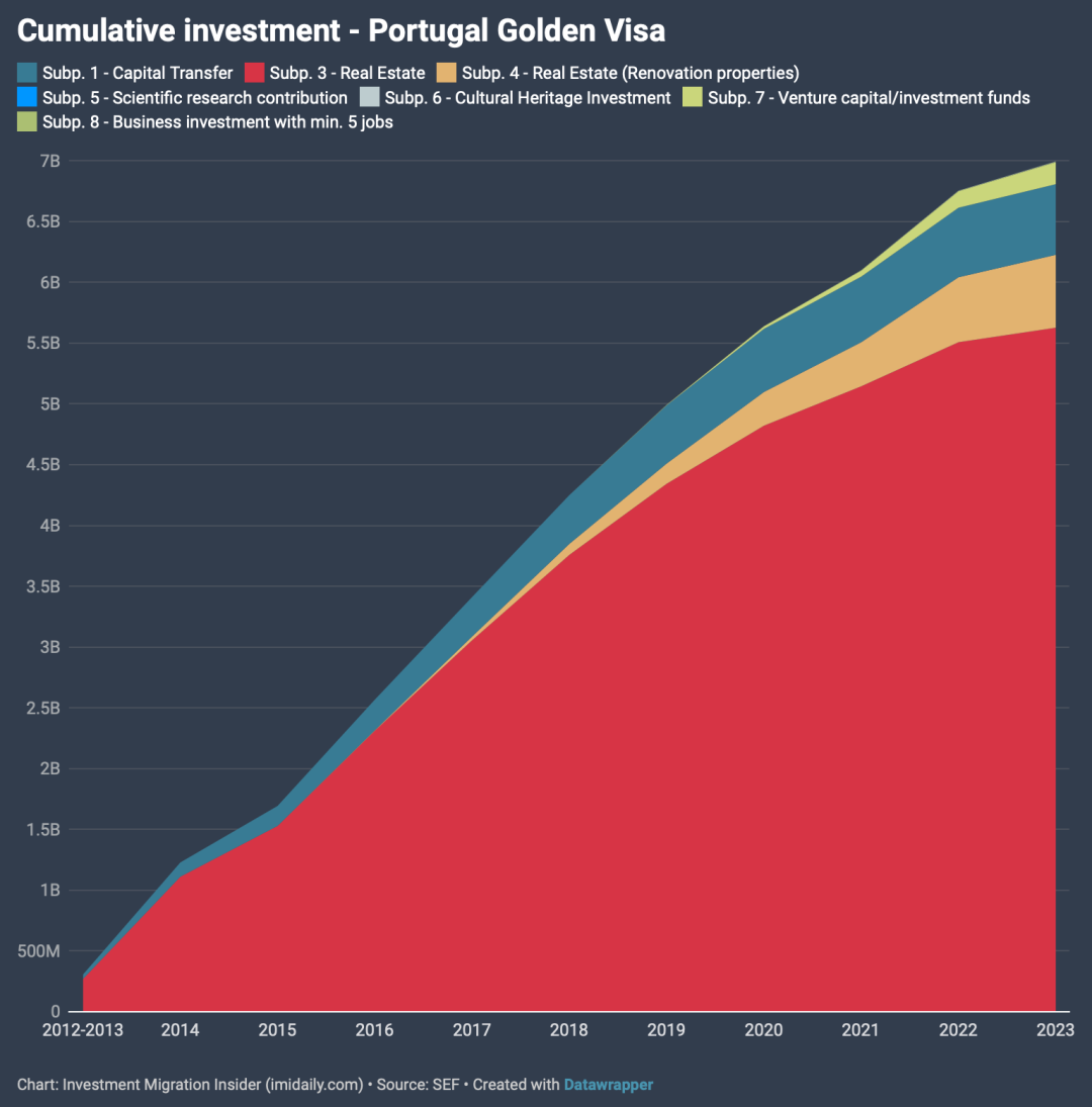 葡萄牙黄金签证项目累计投资额接近70亿欧元,其中大约62亿欧元的投资以直接房产投资的形式呈现。