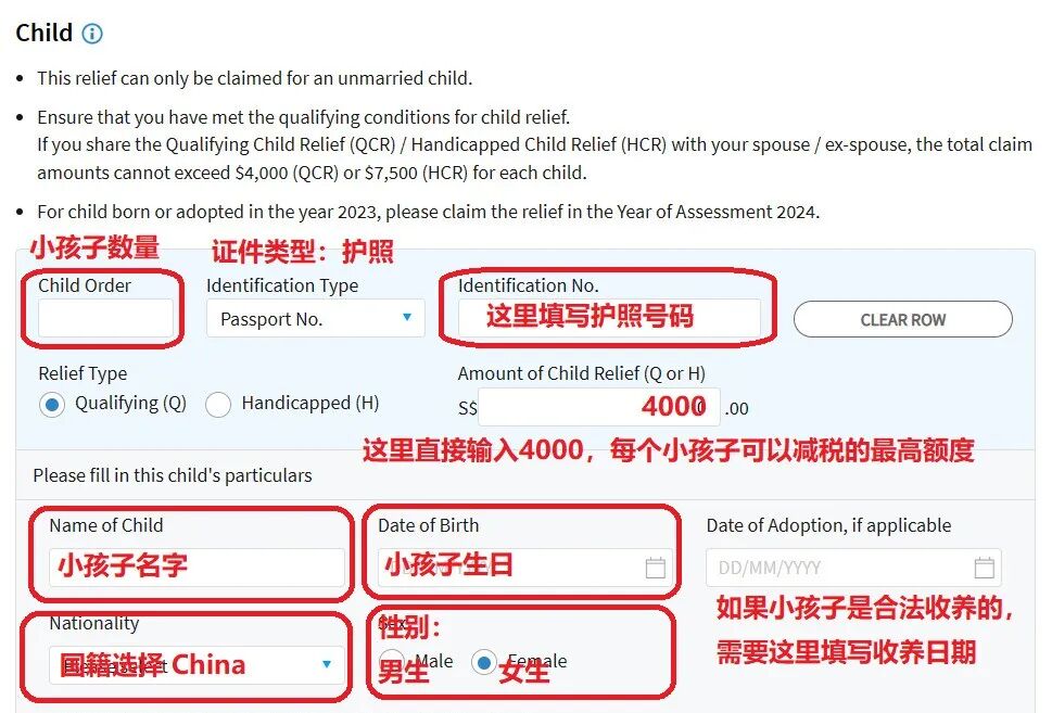Child这一项,每一个孩子可以享有最高$4000的免税额度(最高可直接减税$280)。不过如果夫妻双方都在新加坡做工的话,只能其中一人申报。