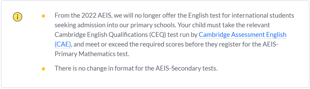 从2022年7月开始,AEIS-primary(小学)将不再为入读新加坡政府小学的国际生提供英语考试。取而代之的是,必须参加剑桥英语评估(CAE)举办的相关剑桥英语资格(CEQ)考试,并在注册AEIS小学数学考试之前达到或超过要求的分数。AEIS中学考试暂无变化。
