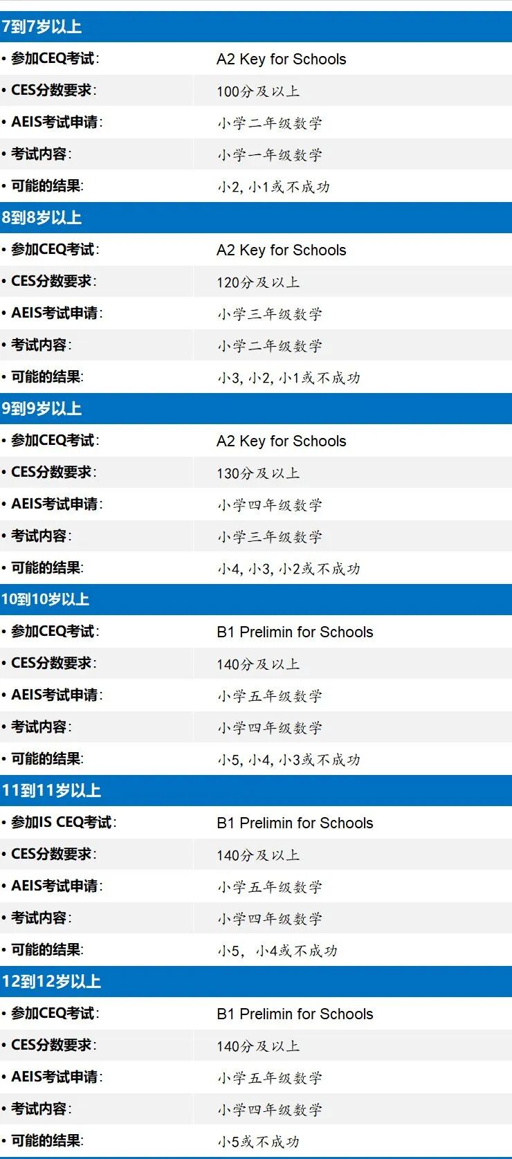 剑桥英语的考试必须是在提交 AEIS 申请前的12个月内进行。也就是,如果在2023年7月提交学生的 AEIS 申请,他们必须在2022年7月之后参加 CEQ 测试。