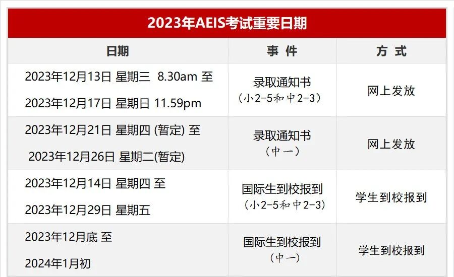 2023年新加坡AEIS考试申请于2023年7月11日上午9点开始,7月24日星期一中午结束,报满即关闭申请通道。2023年AEIS考试将于2023年9月14-15日举行。