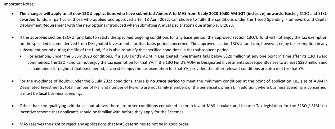 这些变化将适用于从2023年7月5日起向MAS提交的所有13O/U申请。而此前的13O/U项目,特别是在2022年4月18日之后申请和获批的,可以选择满足以上分层支出框架和资本部署要求中的新选项,并在2023年7月5日之后到期的年度申报中提交。