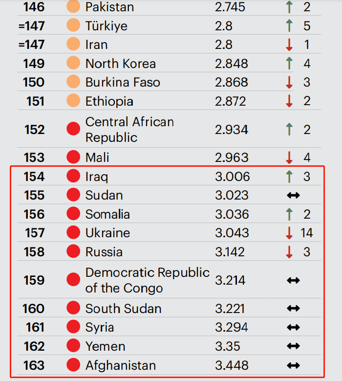 据全球和平指数排名情况来看,十大世界最不和平国家分别是伊拉克、乌克兰、俄罗斯、叙利亚、也门和阿富汗,其中,阿富汗、也门和叙利亚是世界上最不和平、安全风险最高的三个国家。