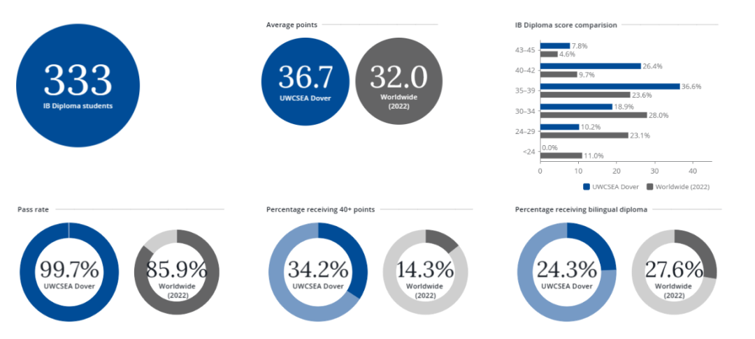 多佛校区333名学生,平均IB成绩为36.7(2022年IB成绩为38.5),合格率为99.7%。