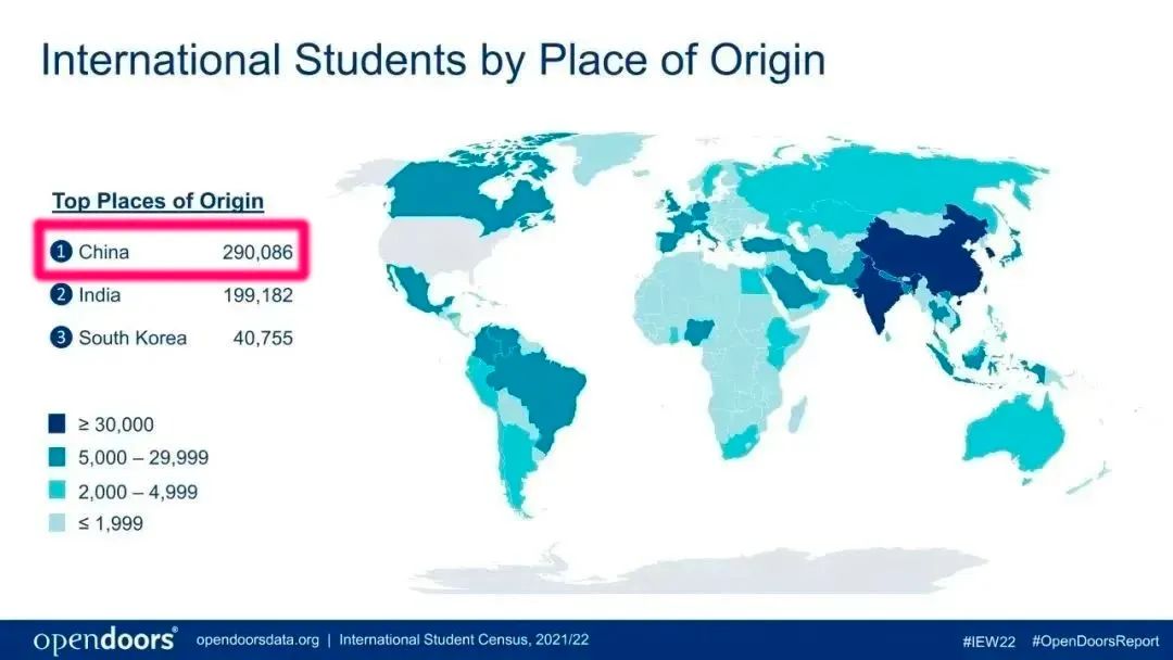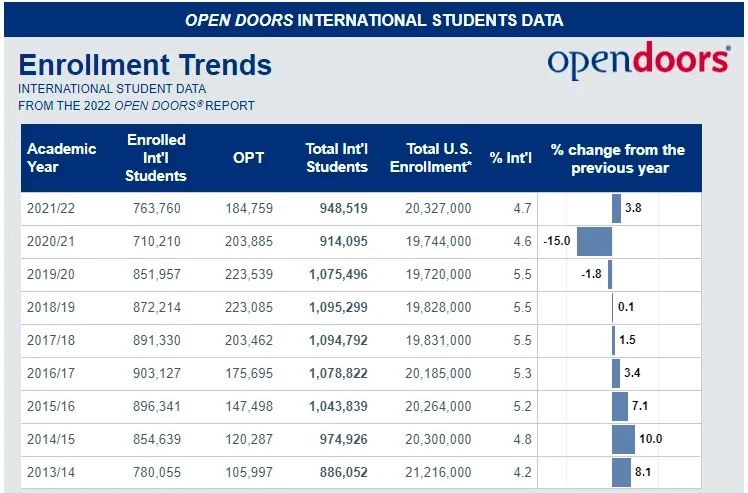 根据美国国际教育协会(IIE)和美国国务院教育与文化事务局(ECA)发布的最新版《2022美国门户开放报告》,2021-22学年美国在读国际学生总数为948,519万人,较上一学年的914,095人,增长了4%。