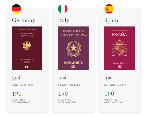 德国、意大利和西班牙则全部跻身第二位,可免签前往 190 个地方。