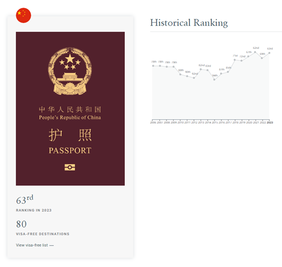 中国护照今年的排名上升了6位,来到了第63位,可以免签或落地签全球80个国家或地区。