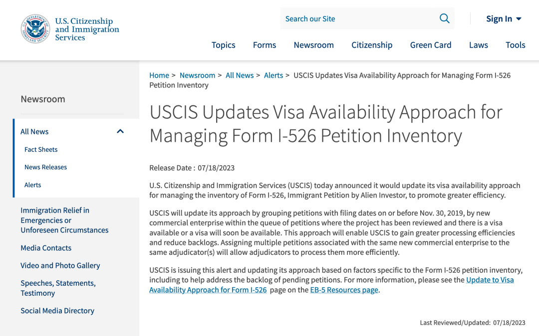 7月18日,美国移民局(USCIS)发布公告,宣布将更新EB-5投资移民的申请审理方法,即:EB-5申请表I-526(外国投资者移民申请表)的审批流程。