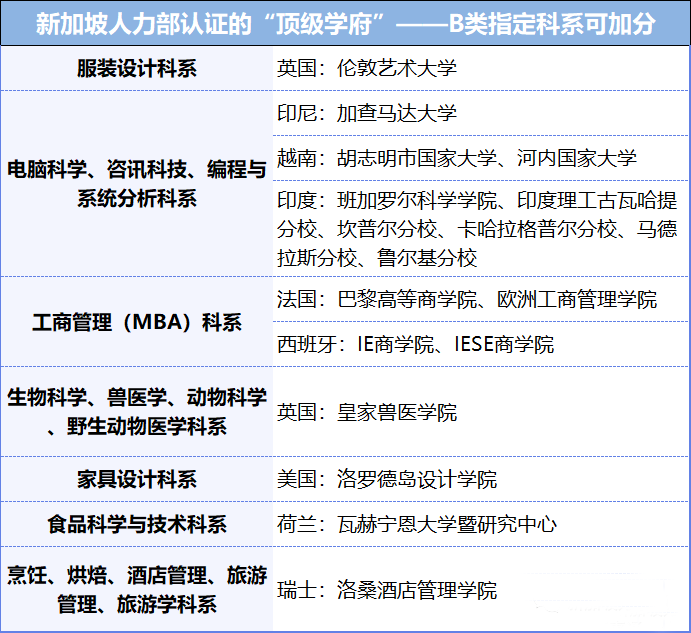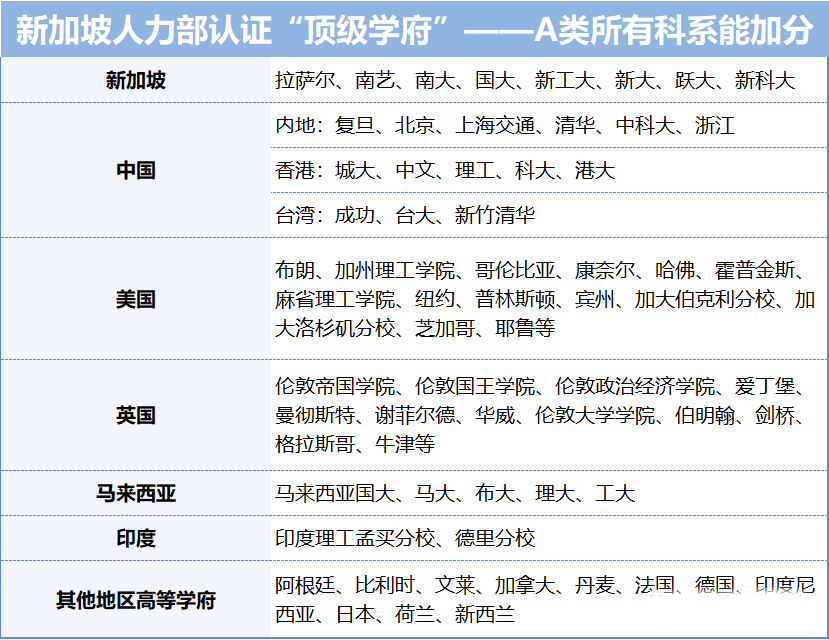新加坡人力部今年也公布了120所被认可的“顶级学府”。该顶级学府以QS世界排名前100大学为主,名单有效期为一年,明年3月会重新公布。