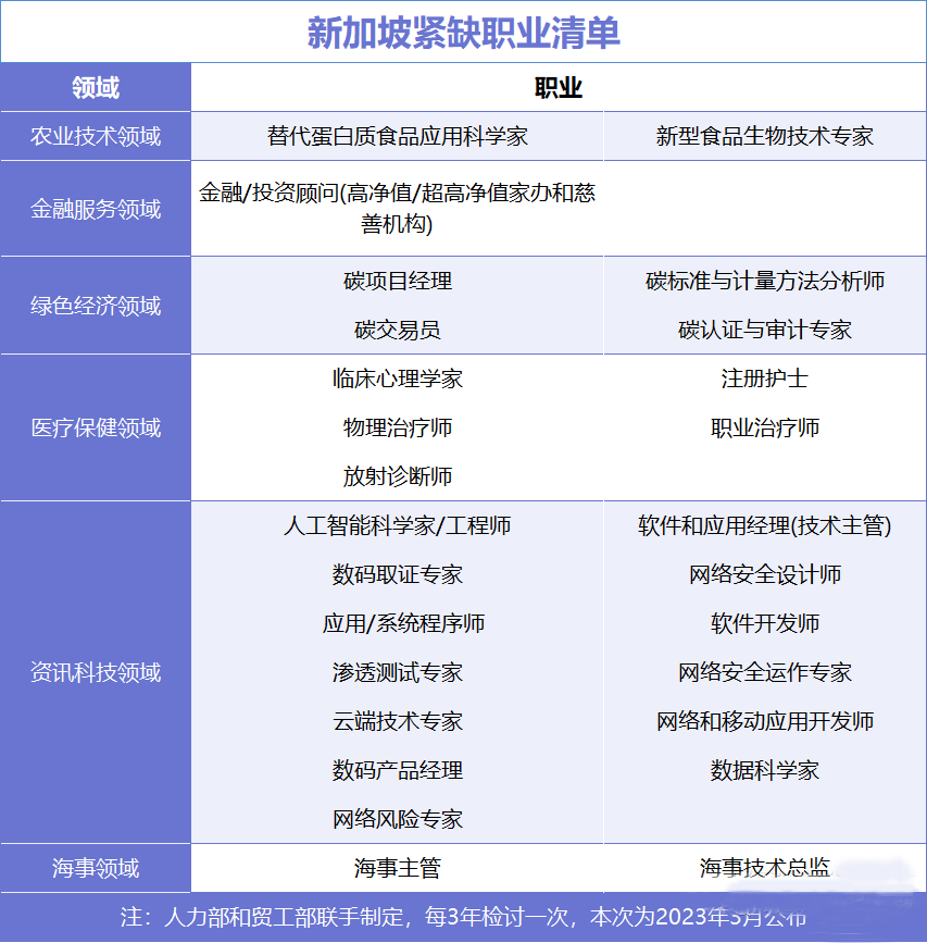 如果您是下图新加坡公布的27类职业之一,如农业技术、金融服务、绿色经济、医疗保健、资讯科技、海事等岗位,将被视为新加坡紧缺型人才,申请EP有加成。